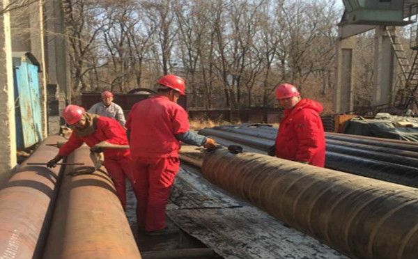 3、材料使用,采取纏繞方法進(jìn)行。粘彈體防腐帶軸向搭接≥10mm,粘彈體防腐帶始末兩端搭接長度≥50mm,粘彈體防腐帶與管體原防腐層搭接≥50mm;聚丙烯防腐膠帶軸向搭接(膠帶寬度)≥50%,兩端包覆粘彈體防腐帶防腐層各100mm。