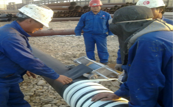 3)、特加強級總厚度≥2.0mm時,可選厚度為2.0mm以搭接膠帶寬度的15~20%方式纏繞一遍;也可只選用厚度為1.0mm以搭接膠帶寬度的50~55%方式纏繞一遍,形成二層結構。