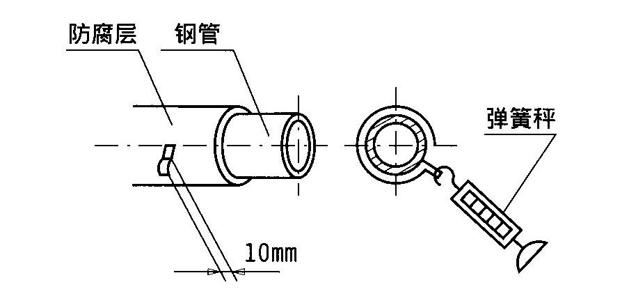6.4.3 粘結力(剝離強度):這一指標直接關系到防腐層的質量,水的滲透能力與膠帶和鋼材之間的粘結力有關,所以應確保膠帶對鋼材具有足夠的粘結力。依據我國標準SY/T 0414-2007中的說明,邁強牌熱塑丁基橡膠改性瀝青類防腐膠帶可定稱為專用防腐帶(膠層厚、粘結力大、帶有防粘膜、可粘結聚乙烯等材料、能確保質量的防腐膠帶)。按我國SY/T 0414-2007標準,剝離強調的測量是采用下列方法進行的;用刀沿環向劃開10㎜寬、長度大于100㎜的膠帶層,直至管體。然后用彈簧秤與管壁成90度角拉開,拉開速度不大于300㎜/min,剝離強度應大于18N/㎝,該測試應在纏好膠帶24小時后進行。如下圖所示: